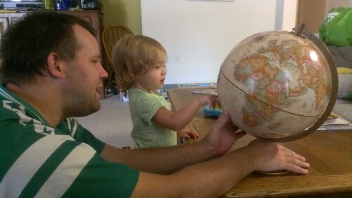 Jo loves looking at the ‘lobe. She was building a tower in her room and suddenly ran into the living room saying “mei mei” wanting to point to NYC. She also loves pointing to Argentina.